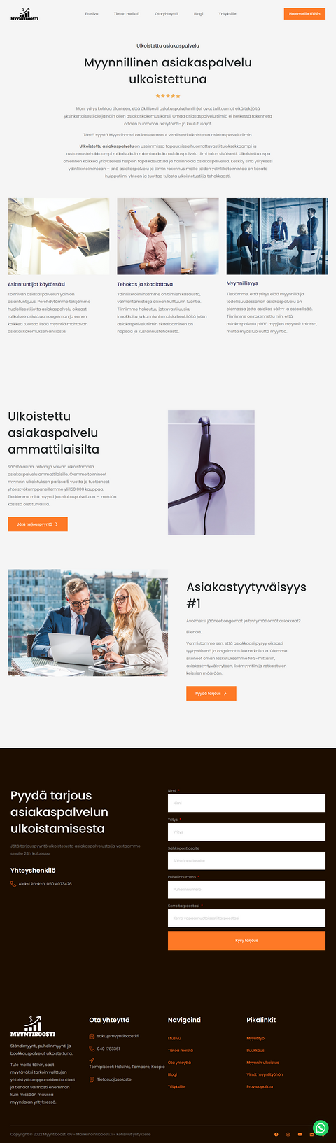 Säästä aikaa, rahaa ja vaivaa ulkoistamalla asiakaspalvelu ammattilaisille. Olemme toimineet myynnin ulkoistuksen parissa 5 vuotta ja tuottaneet yhteistyökumppaneillemme yli 150 000 kauppaa. Tiedämme mitä myynti ja asiakaspalvelu on – meidän käsissä olet turvassa.